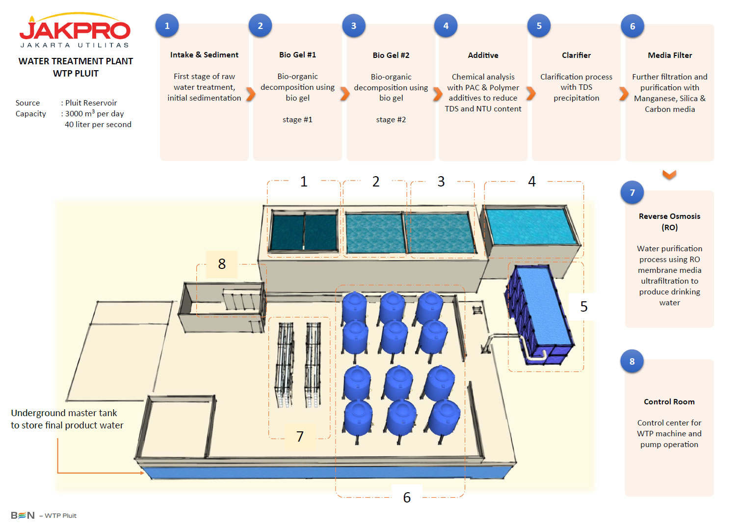 WTP Pluit is owned by JAKPRO and operated under KSO treaty between Jakarta Utilitas Propertindo and Memiontec Indonesia. Constructed in 2016 and comissioned in 2018, WTP Pluit serves clean water to 1.6 million people in the Pluit area and its surroundings by producing 3000 m3 of clean water per day.